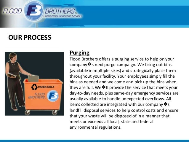 Flood Brothers - Nationwide Commerical Relocation Services 1. Flood Brothers Commercial Relocation Services 2. Flood Brothers has expertise and knowledge in the following areas of commercial services: » Systems Furniture Installation » Asset Management » Storage » Computer Disconnect/Reconnect » Server Room Moves » Purging » Electronic Destruction » Document Management » Shredding ... Access This Document